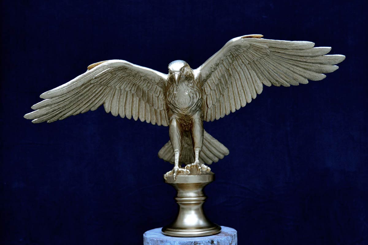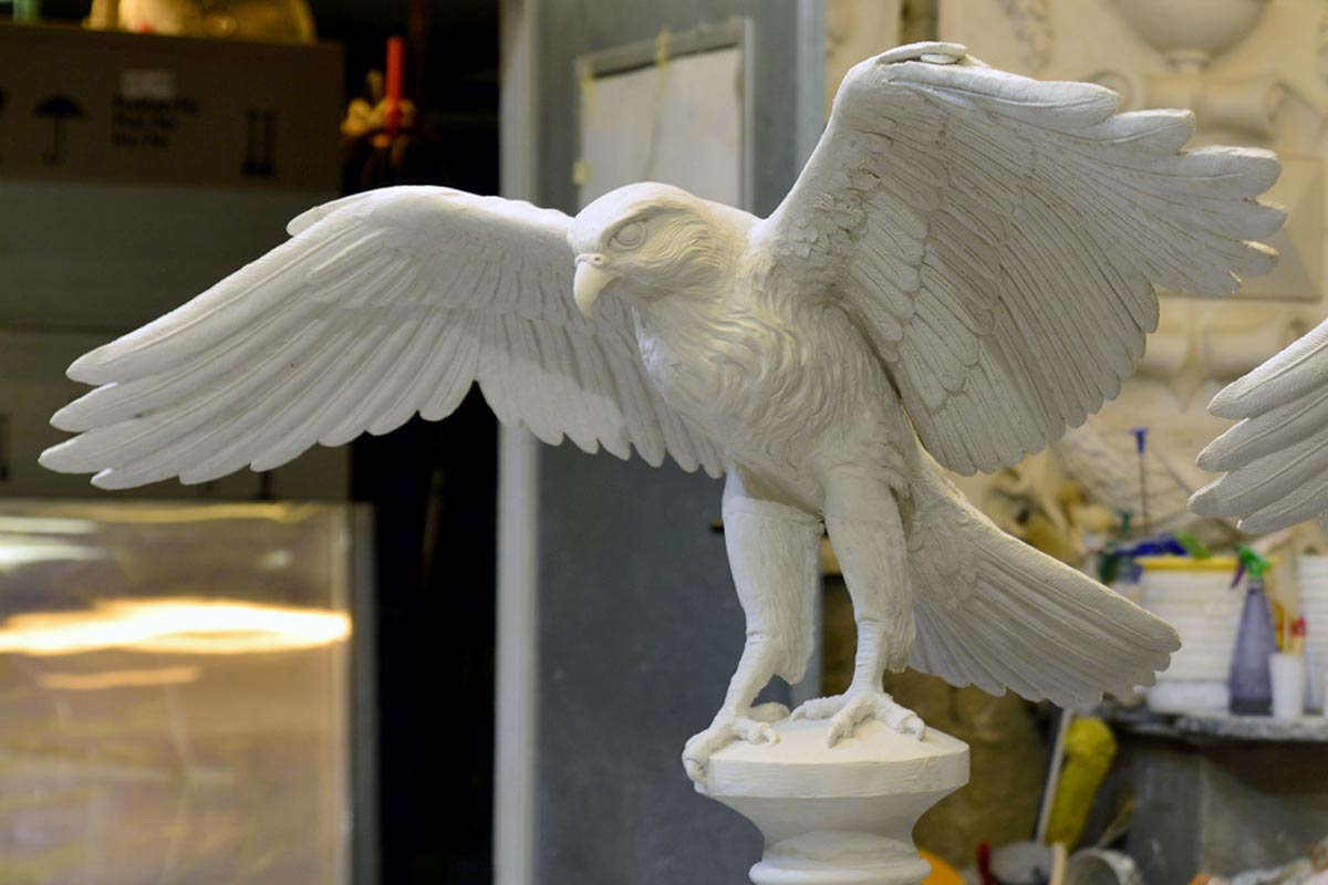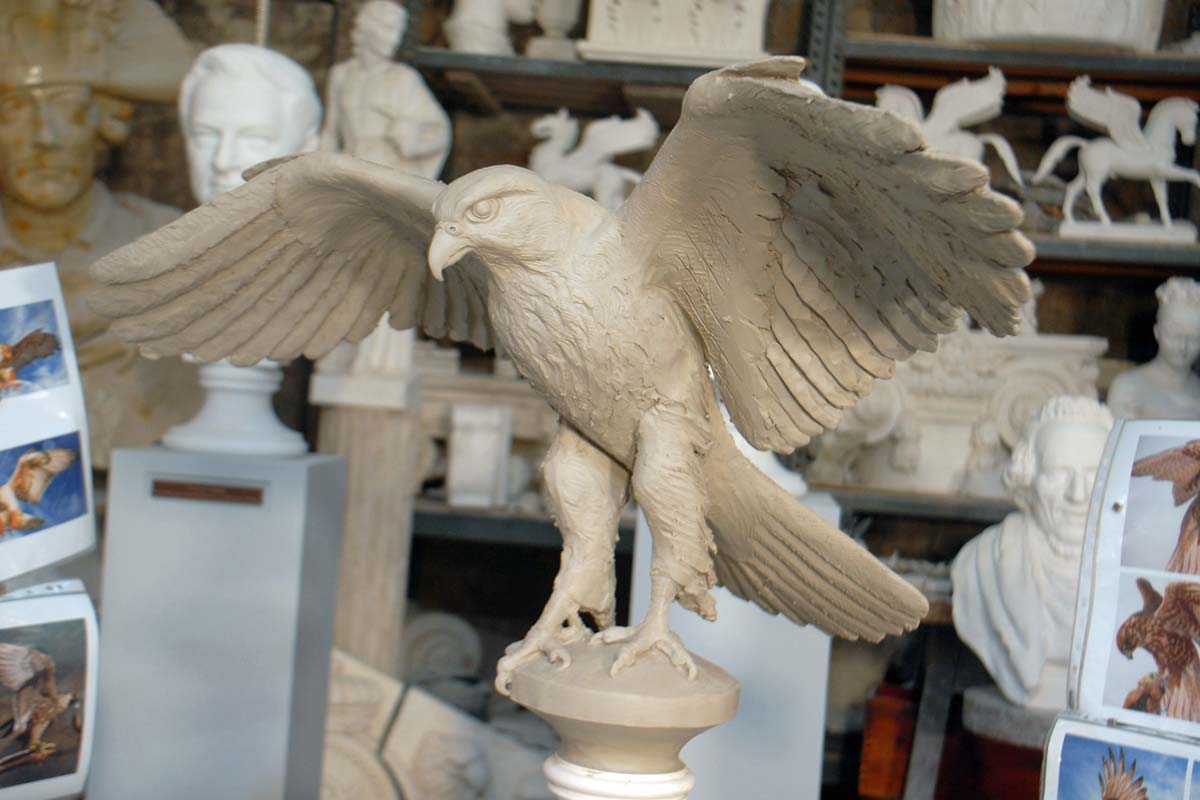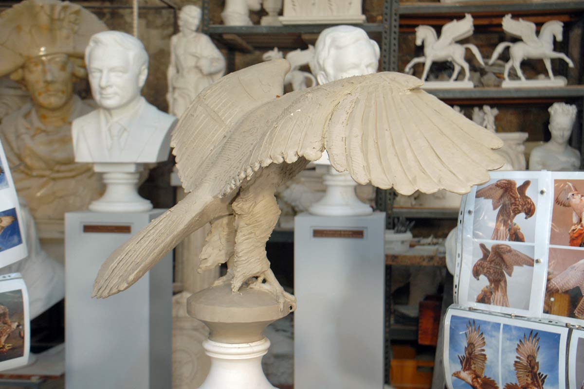 Künstlerische Modellerarbeitung eines naturalistischen Jagdfalken, Stuckgips für Bronzeguss