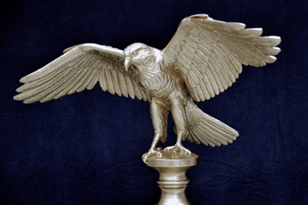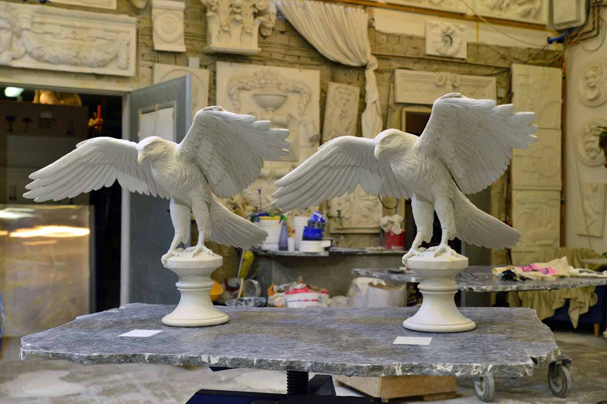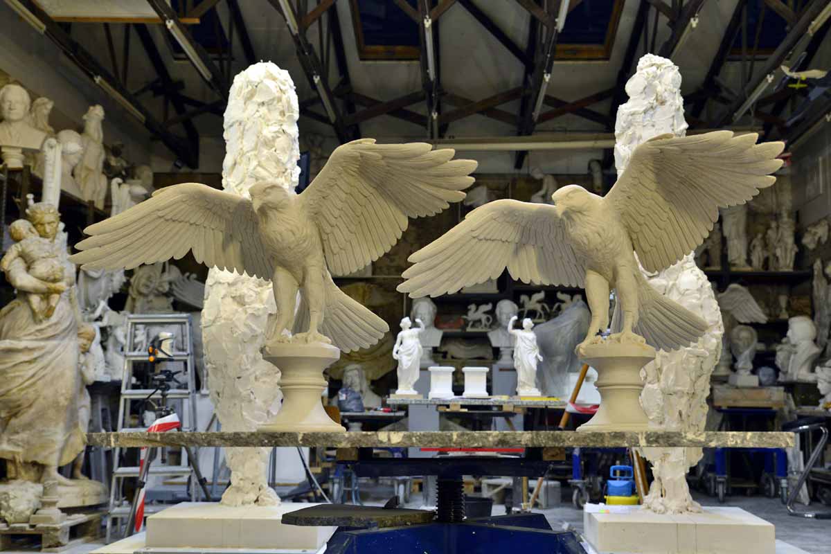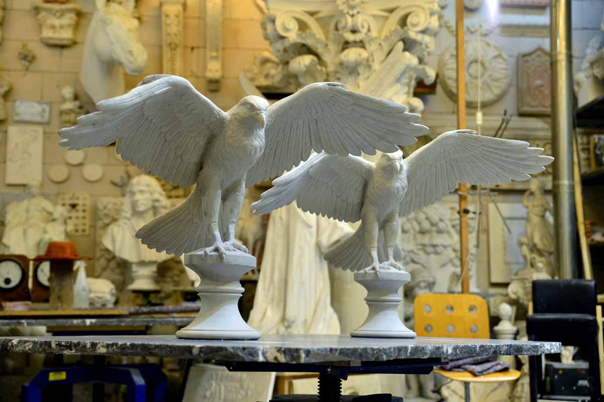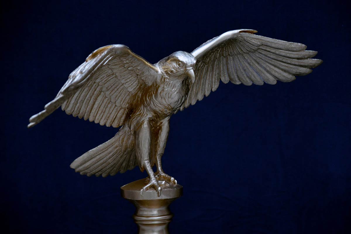 Künstlerische Modellerarbeitung eines naturalistischen Jagdfalken, Stuckgips für Bronzeguss